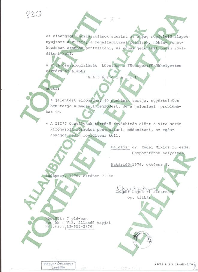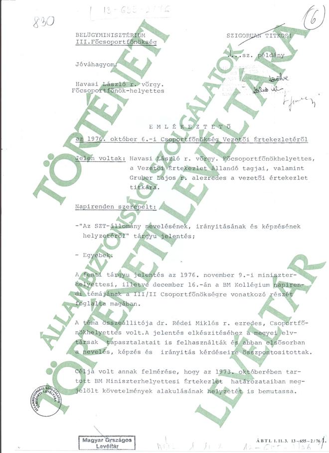 Emlékeztető az 1976. október 6.-i Csoportfőnükség Vezetői Értekezletéről